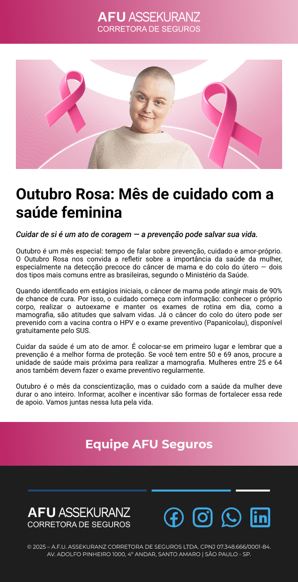 Outubro é o mês da conscientização, mas o cuidado com a saúde da mulher deve durar o ano inteiro. Informar, acolher e incentivar são formas de fortalecer essa rede de apoio. Vamos juntas nessa luta pela vida.